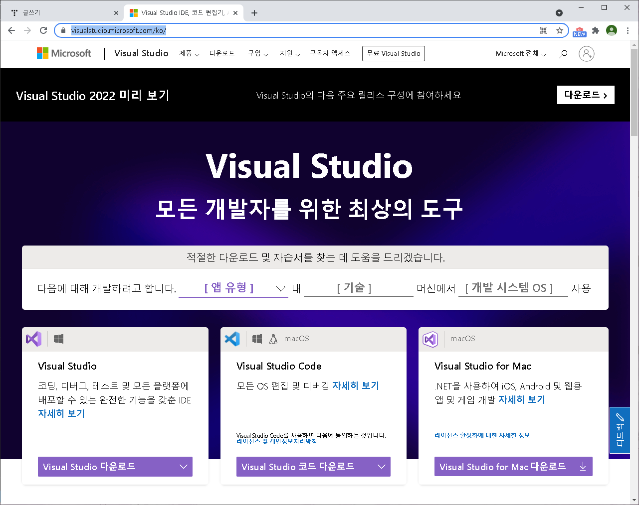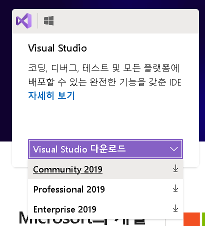 아래 경로로 가시면 Visual Studio를 다운 받을 수 있습니다.
