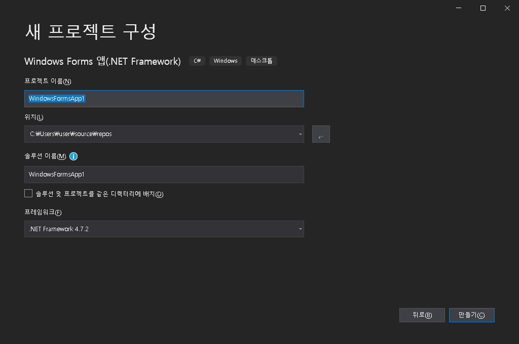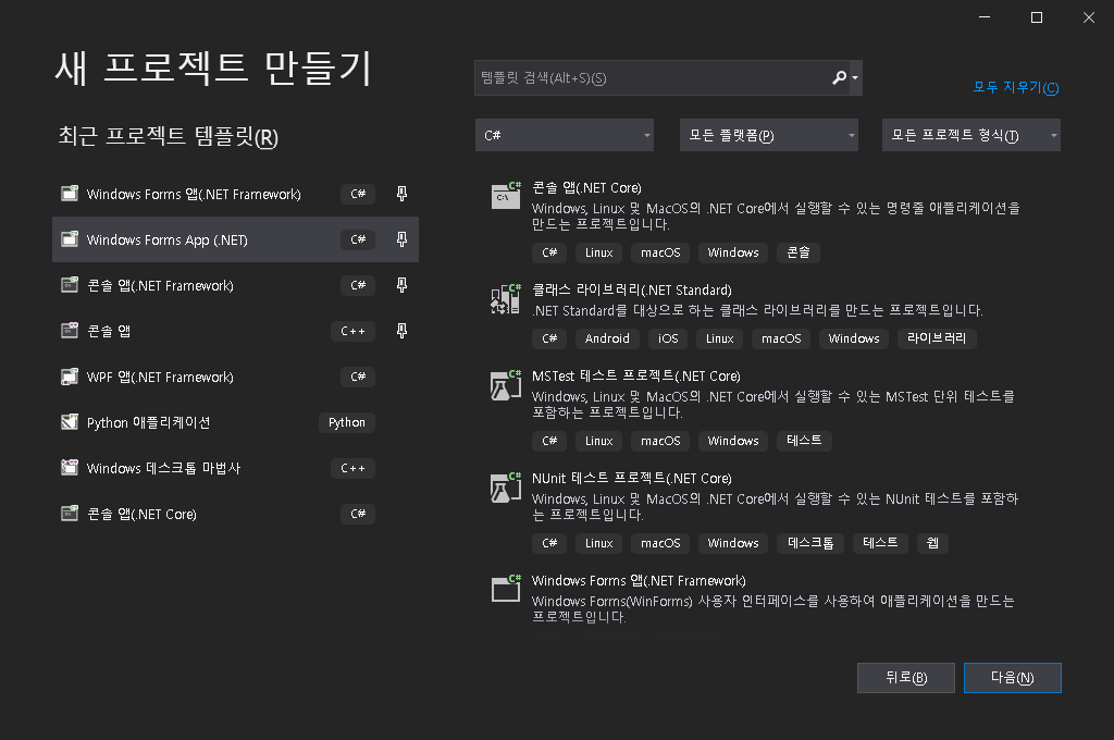 이 부분에서 C#으로 정렬 해 보면, Windows Forms 앱(.NET framework) 가 보일 겁니다.
