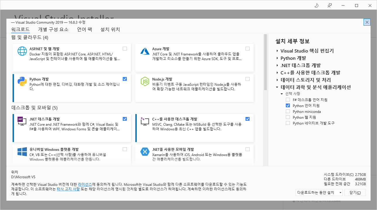 왜냐하면, C#이 .NET framework에서 돌아가는 언어이기 때문에 그렇습니다. 아래 설명을 보셔도 C# 관련 설명이 잘 나와 있습니다. (C나 C++개발도 같이 하실 분은 오른쪽에, C++을 사용한 데스크톱 개발도 표시 하시면 됩니다.)