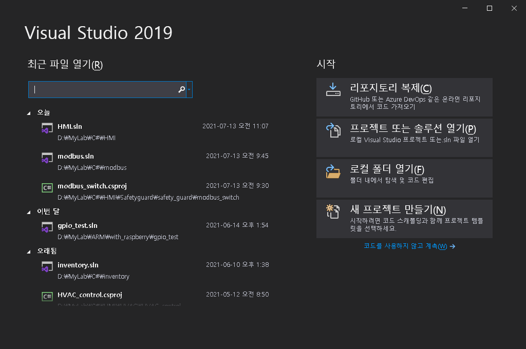 저는 기존에 사용하던 프로젝트를 열었기 때문에 오른쪽에 몇 개의 프로젝트가 미리 만들어져 있는 것을 볼 수 있죠.