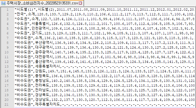 저는 서울, 경기도, 인천, 수도권합계만 보고 싶으니 나머진 지우고 '한글'은 영어로 변경해주겠습니다. (이 선택은 통계청 사이트에서 선택한 후에 csv파일로 받으셔도 됩니다.)