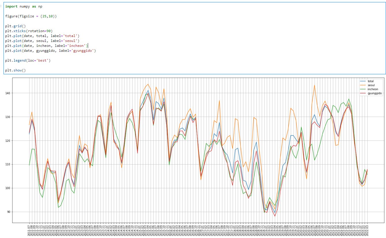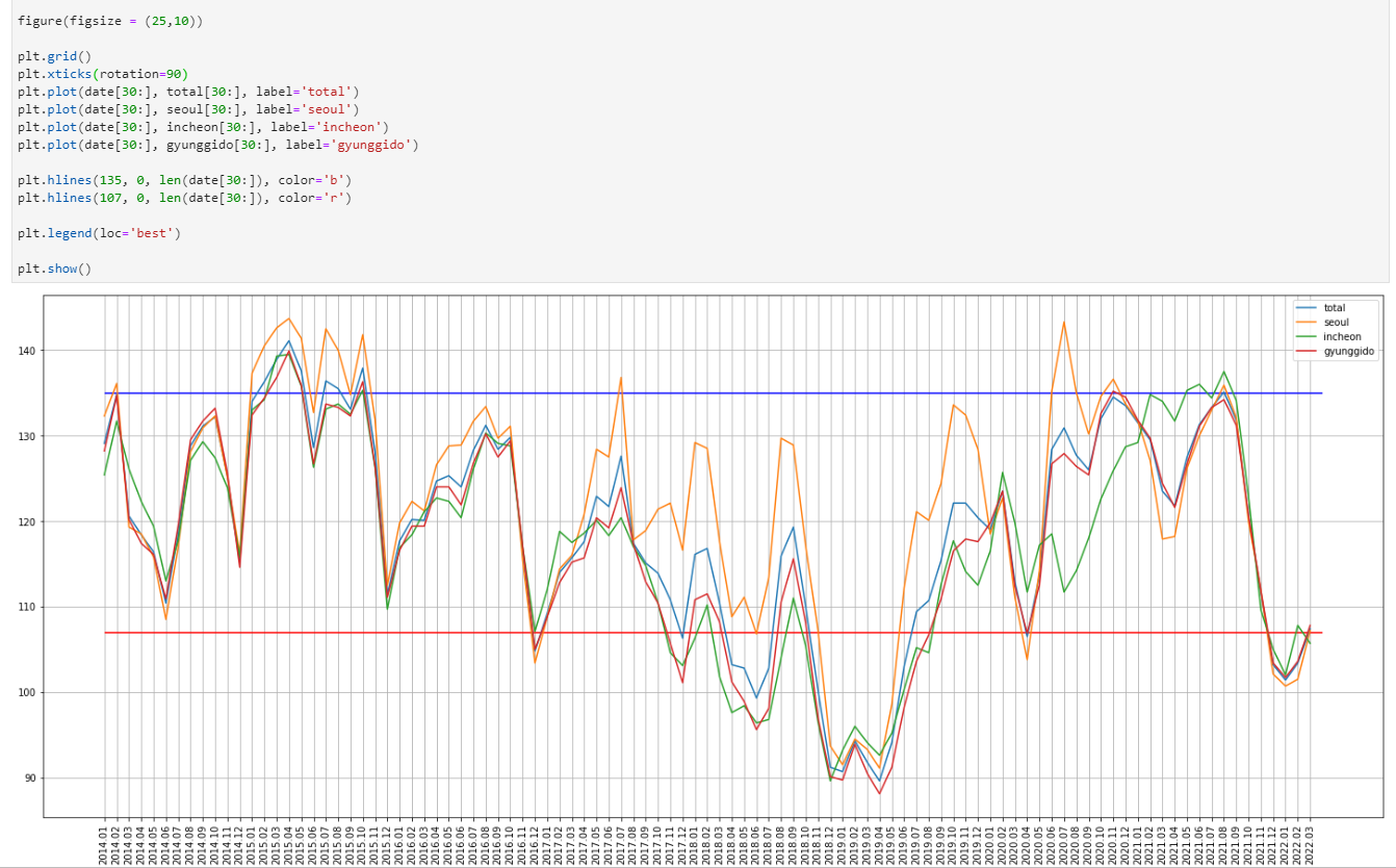 자 우리에게 seoul, total, incheon, gyunggido, date 데이터가 모두 구해졌습니다. 차트를 그려보면 과연 매수지수가 뉴스에 나온대로인지 어떤지 알 수 있습니다.