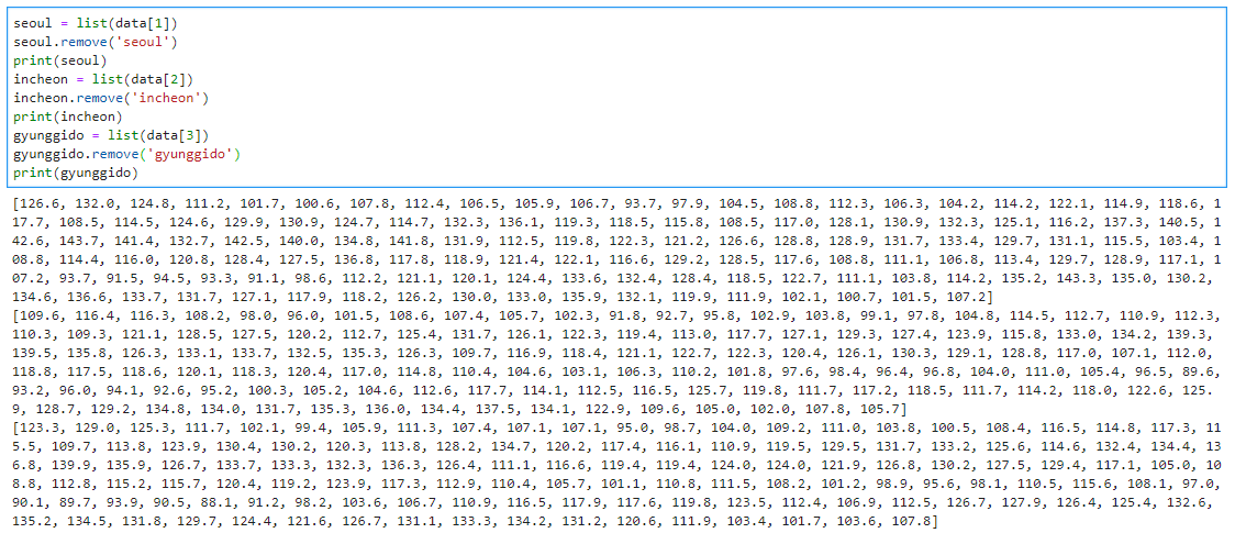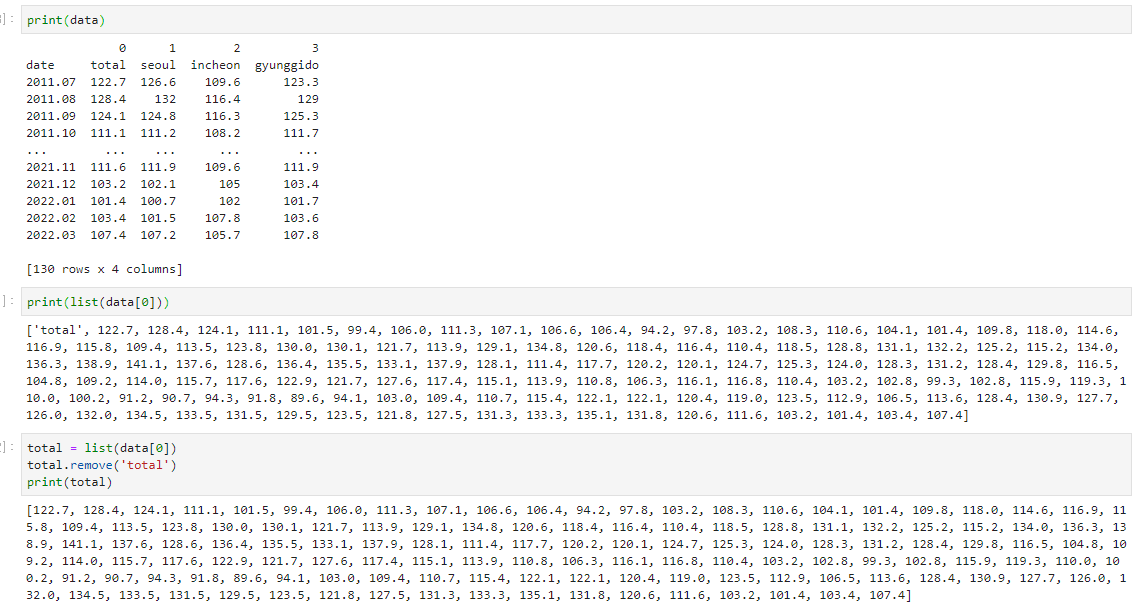 보시면 날짜 정보와 수도권합계, 서울, 인천, 경기도 데이터만 남겨져 있는 걸 볼 수 있습니다.
