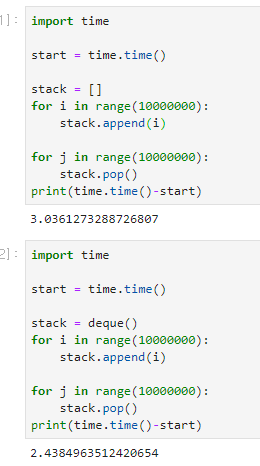 근데, 파이썬에서는 list로 stack을 구현하면 효율상 썩 좋지 않습니다. (왜냐하면, 파이썬의 리스트는 최대 길이를 넘어선 추가가 일어나면 복사를 해서 옮기는 과정이 추가됩니다.)