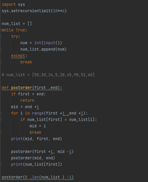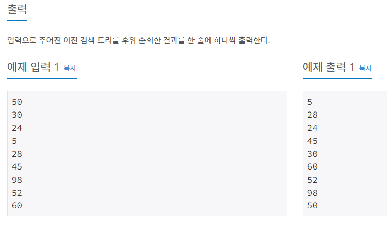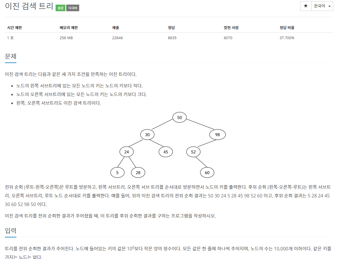 이번에는 이진검색트리에서 '전위순회'한 값 순서가 주어질 때, 이 값을 '후위순회'한 값 순서로 바꾸는 문제입니다.