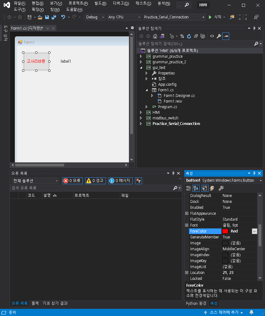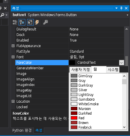 속성에서 ForeColor를 보시면, 색을 선택할 수 있습니다. 여기서 색을 바꿔보겠습니다.