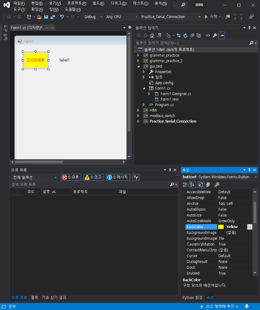 버튼의 배경 색도 바꿔보겠습니다. 속성에서 약간 위로 올라가면 BackColor 부분이 있는데, 거기서 선택을 해보세요.