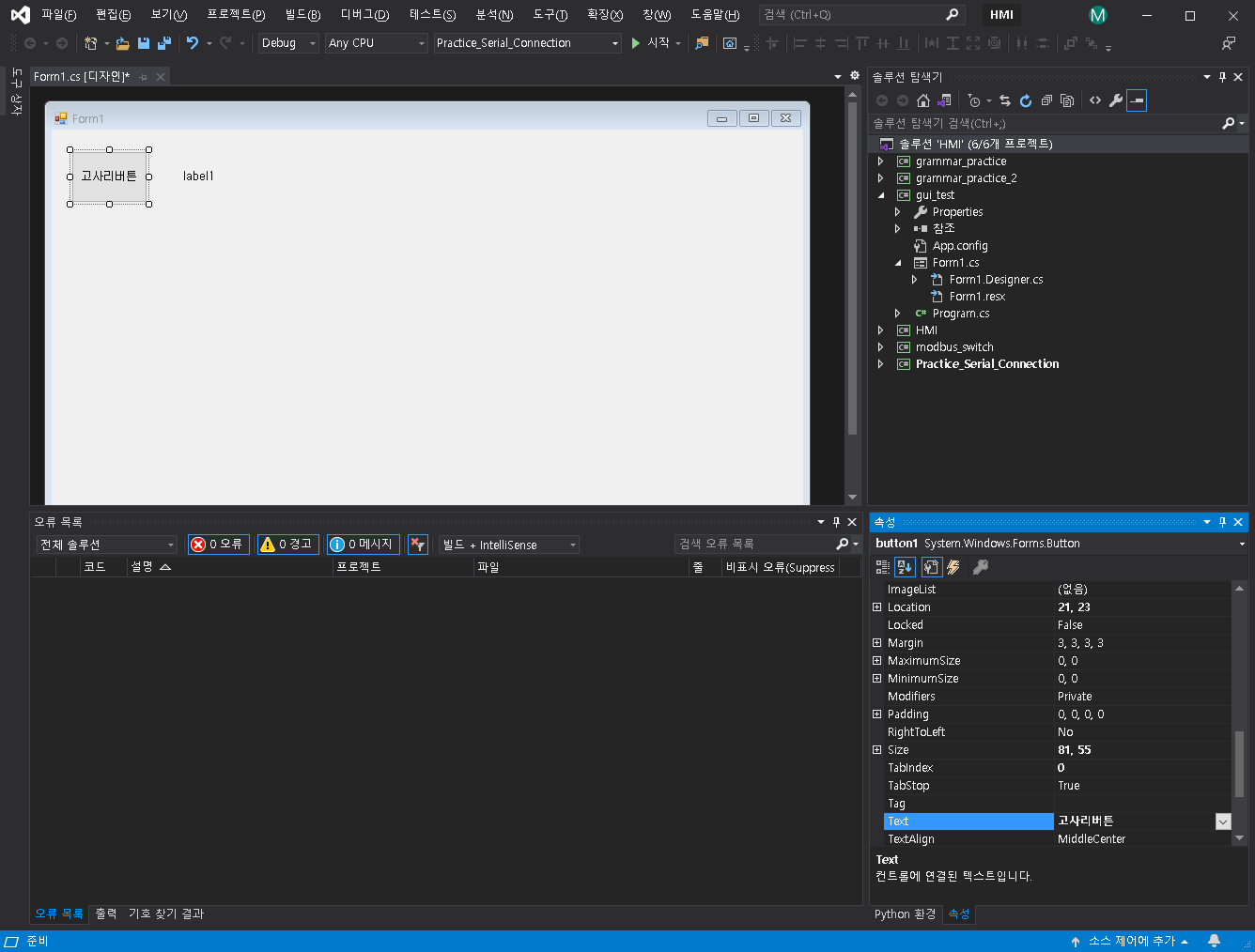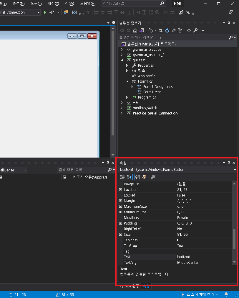 네 여기서 Text라는 부분의 button1 글자를 바꿔보겠습니다.