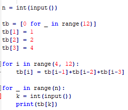 처음에 1,2,3을 tb라는 리스트에 넣어두고, for문으로 나머지를 채워준 후에 그저 입력값을 index로 보내면 됩니다.