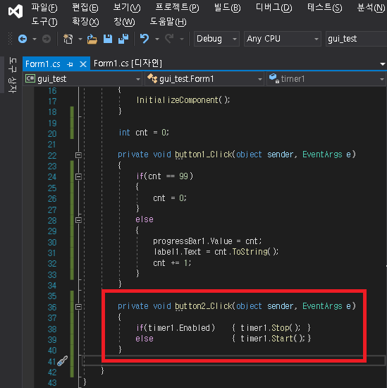 timer1가 Enabled라면, Stop시키고, 그렇지 않다면 Start 시키는 겁니다.