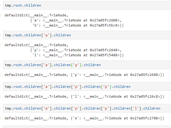 apple을 살펴보고자, a노드 밑의 p노드를 살펴보니 children으로 p가 있다고 나오고, 해당 노드 밑에는 l이, 그 노드 밑에 e가 있다고 나옵니다.