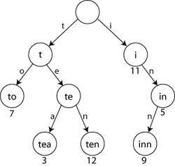 이게 뭘 의미하는거냐면, to와 tea와 ten이라는 단어는 똑같이 t로 시작하죠? 그래서 t라는 노드 밑에 위치합니다.