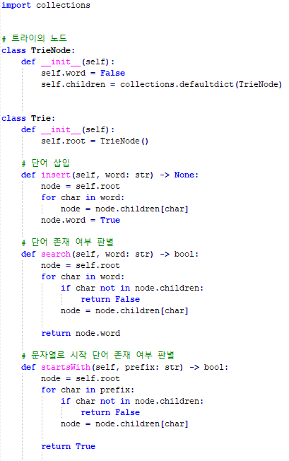 word로 들어온 문자열을 char로 한단어씩 잘라서 node.children에 설정하고, 해당 노드를 다시 node로 설정해서 children의 children으로 단어들을 넣어나가는 것이죠.