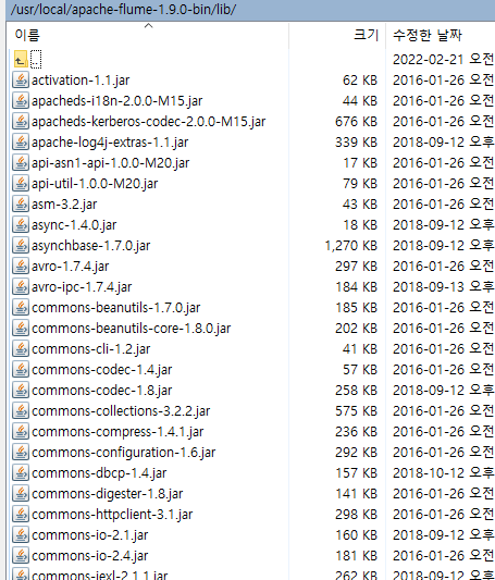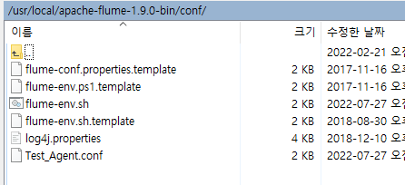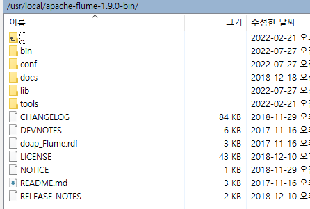 먼저 Flume을 설치하셨다면 아래의 폴더 및 파일들을 보실 수 있습니다.