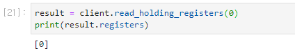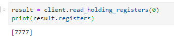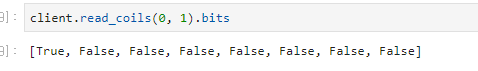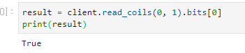네 맨 앞의 값이 True로 바뀐 걸 보실 수 있습니다. 따라서, coil의 값을 이용해서 스위치 처럼 동작시키고자 한다면 bits로 읽은 리스트의 맨 앞 값만 사용하면 됩니다.