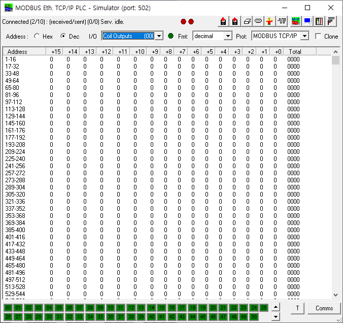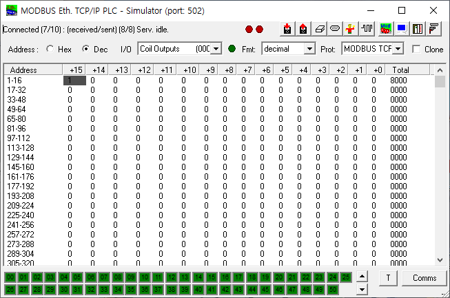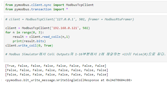 위 코드는 192.168.0.121이라는 PC의 502포트 (modbus 기본 포트죠)에 접속해서, coil 의 0번부터 2까지 값을 가져오고, 0번 주소를 1로 변경하라는 코드입니다.