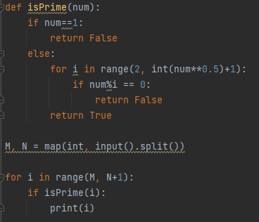 첫째 줄에 자연수 M과 N이 빈 칸을 사이에 두고 주어진다. (1 ≤ M ≤ N ≤ 1,000,000) M이상 N이하의 소수가 하나 이상 있는 입력만 주어진다.