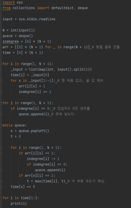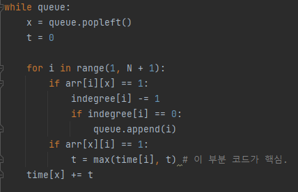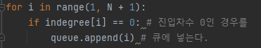 위에서부터 두 번째 있는 for문은 진입차수가 0인 것만 먼저 큐에 넣는 코드입니다.
