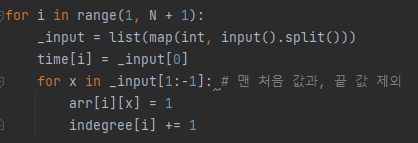 먼저 제일 위에 있는 for문은 arr과 indegree를 만드는 것입니다.
