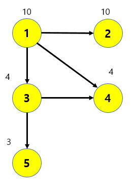 1번째는 10 -1 즉, 10이라는 시간이 소요되고 1번째 노드로 들어오는 노드(먼저 지어져야 하는 건물)는 없다는 것입니다.