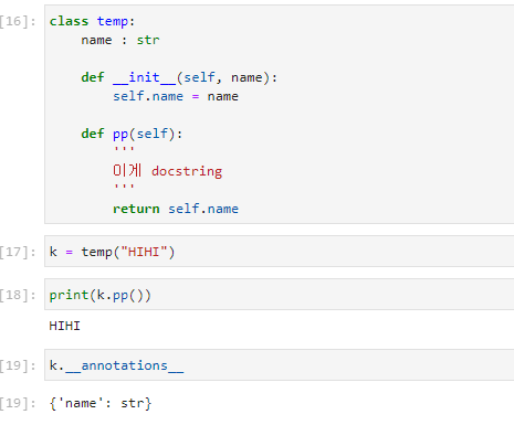 초기 전달인자 name의 자료형은 str이라고 알려준 것이다. 물론, 이 어노테이션은 강제력이 없다. str로 써 놓았지만, 숫자를 넣어도 동작은 한다. 단지, 해당 코드를 이해하는데 있어서 도움이 될 수 있는 '정보'로써 존재하는 것이다.