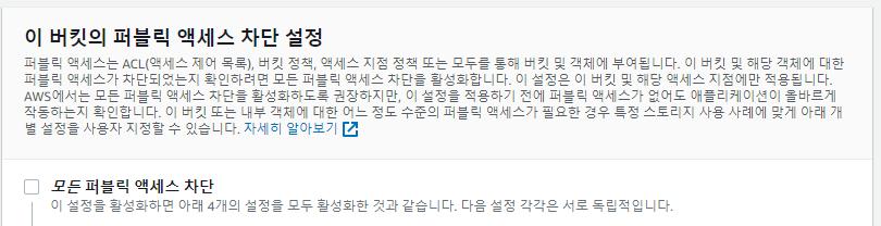 그리고 저는 퍼블릭 액세스 차단 설정을 풀어주었습니다. 제 PC에서 S3를 접속해서 사용할 것이기 때문이죠.