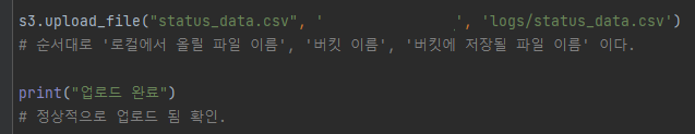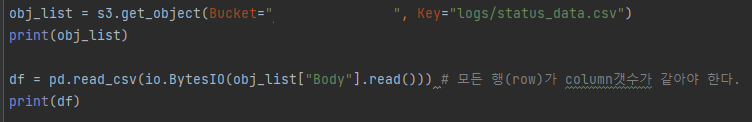 s3 객체는 기존코드와 같고, Bucket 부분만 가려놓았습니다. Key에는 logs폴더 내의 status_data.csv파일을 읽어오겠다는 것입니다. (Key는 반드시 대문자로 시작해주셔야 합니다. key로 하면 실행이 안됩니다.)