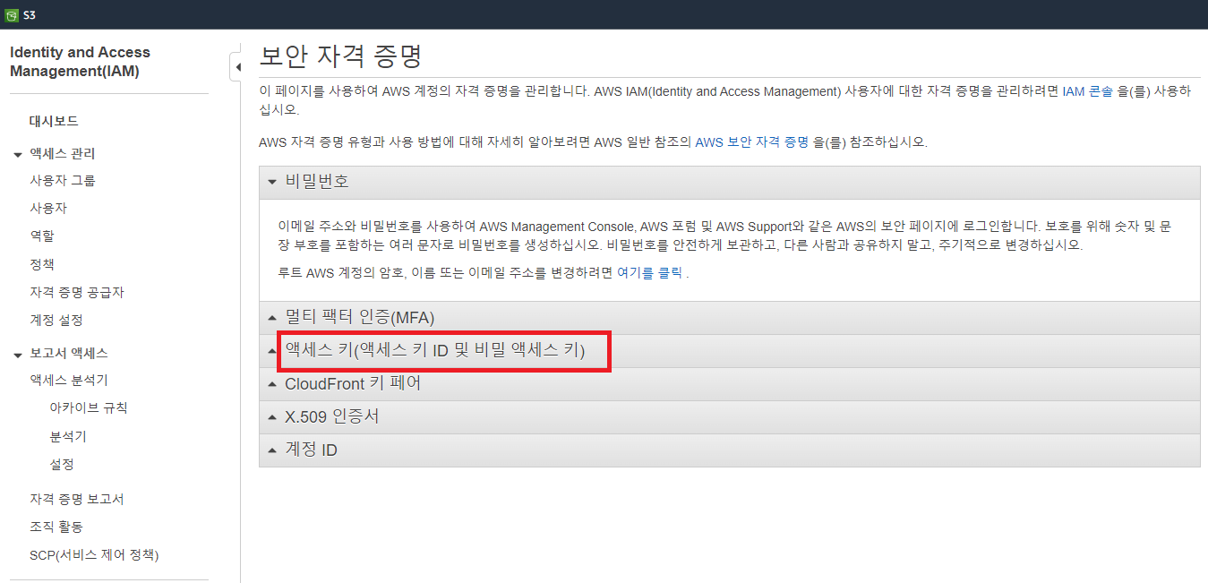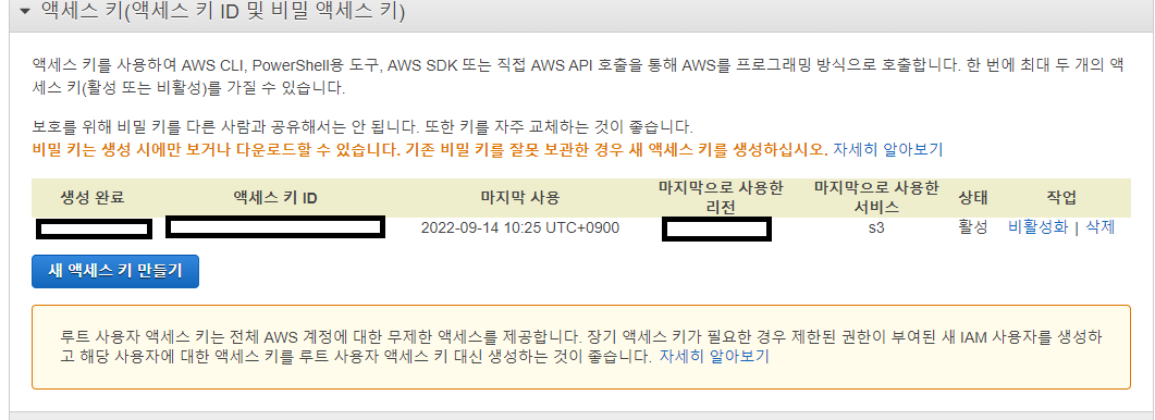 저는 이미 만들어서 아래와 같이 나옵니다. 만들지 않은 분들은 '새 액세스 키 만들기'를 누르시면 키가 생성됨과 동시에 csv파일 하나가 다운로드 됩니다.
