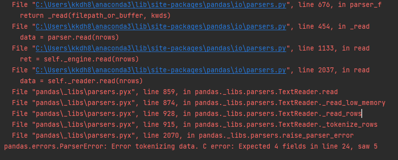 이런 tokenizing data 에러를 마주할 수 있습니다.