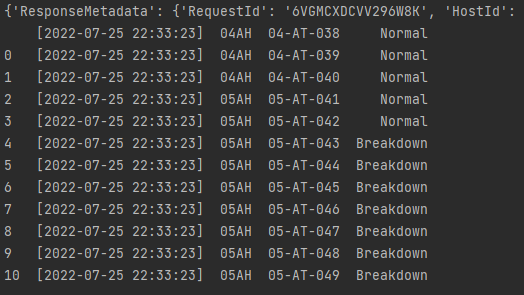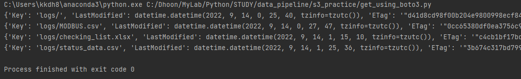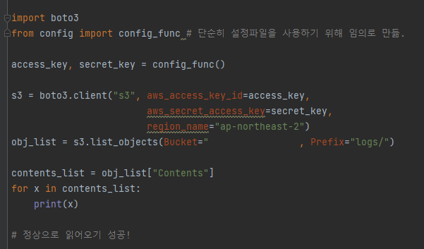 위 코드는 s3라는 이름으로 client객체를 생성하고, 해당 객체를 이용해서 logs/폴더 내의 objects들을 가져옵니다.