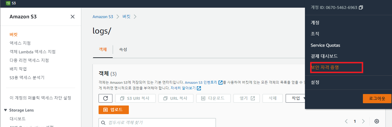 그럼, S3를 쓸 때 aws_access_key_id와 aws_secret_access_key는 어디서 확인하냐~ 가 문제네요.