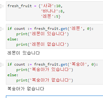 위 코드에서 fresh_fruit.get을 통해 해당 key의 값을 가져온다. 가져온 값을 곧바로 count에 넣고, count에 대해 if 조건문이 실행되는 것이다.