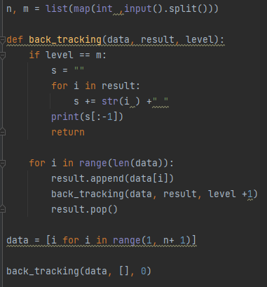 여기서 level == m(=3)과 같기 때문에 조건문으로 빠집니다. 그래서 1,1,1이 제일 먼저 출력되고 return이 이뤄집니다.