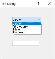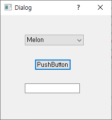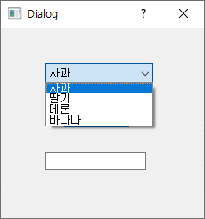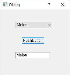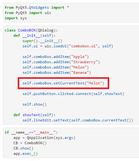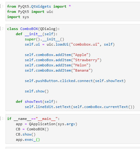 버튼을 누르면 실행되는 showText에서 comboBox의 현재값 즉, currentText( )를 이용해서 현재값을 가져오고 그 값을 lineEdit에 띄우고 있네요.