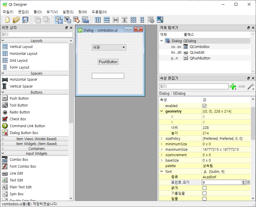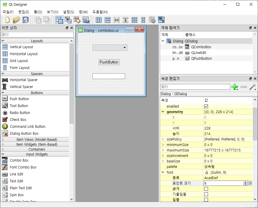 이렇게 추가 하고 난 후에 '확인'버튼을 누르고 다시 Qt Designer를 보면