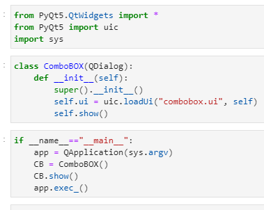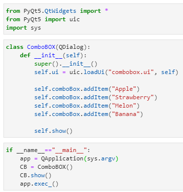 보시면 comboBox객체에 addItem을 이용해서 직접 글자를 '추가'하고 있습니다.