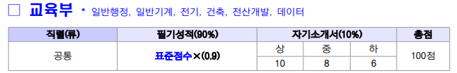 또한, 이 통계청의 경우 자기소개서까지 점수차이가 5점씩 나므로 굉장히 잘 써야 한다는 것을 알 수 있죠.