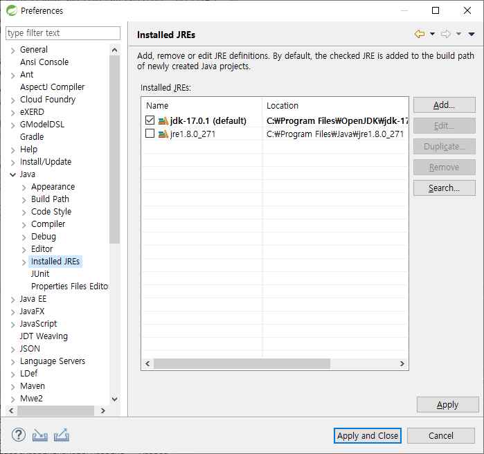 그리고 왼쪽 분류에서 Java -> Installed JREs를 눌러주세요.