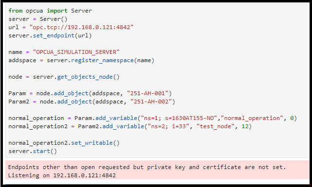 add_variable이 중요한데, ns=1은 노드의 번호이고, s=로 시작하는 것이 실제 노드의 '이름'입니다. 그 옆에 "normal_operation"은 사람이 판단하는데 도움을 주는 이름이죠. 그리고 마지막으로 숫자는 '초기값'입니다.