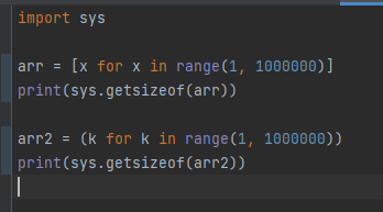 위 코드를 통해 알 수 있는 내용은, 만일 굉장히 큰 list를 for문으로 순회해야 한다면 list로 만들지 말고, generator로 만들어서 사용하시면 메모리 사용량을 줄일 수 있다는 것입니다.