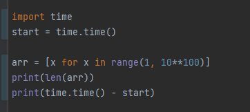 위 코드는 임의로 제가 10의 100제곱만큼의 범위를 가진 리스트를 생성하는데 얼마나 시간이 걸리는지 보고자 만든 코드입니다.