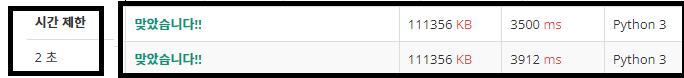 네 제한이 2초로 되어있는데, 제출한 파이썬 코드의 시간이? 2초가 넘네요. 즉, 언어마다 시간제한 기준이 조금 다를 수 있습니다. 이런 내용은 문제에 언급되어 있지 않을 수 있으니 이상하다 싶으면 확인 해 보는 것도 좋은 습관입니다.