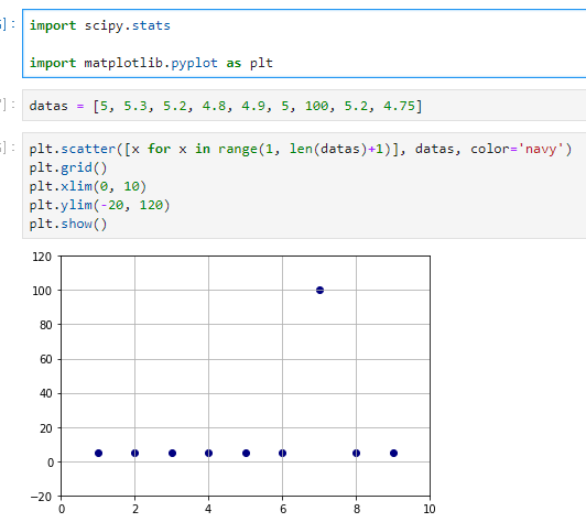 아래 차트로 그렸는데, 잘 보시면 100이라는 하나의 값만 약 5 근처의 값으로부터 많이 떨어져 있죠?