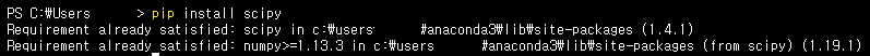 Jupyter를 실행 한 후에, 터미널에서 pip install scipy를 입력하시면 자동으로 설치 됩니다. 저는 미리 설치가 되어 있었어서 아래와 같이 already satisfied 라는 문구가 나오네요.