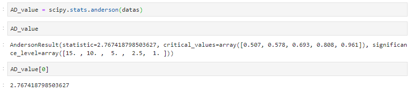 네 저는 anderson함수의 결과를 AD_value라는 변수로 받았고, 해당 결과는 위와 같이 나옵니다. 그 중에 첫 번째 값만 뽑아내어서 확인해보니 2.767이 나옵니다.