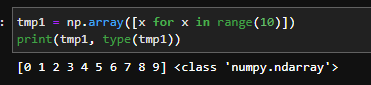 10개의 숫자를 0부터 시작해서 np.array라는 함수에 집어 넣었고, 반환된 값이 tmp1에 담겨졌습니다.