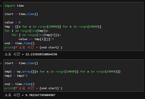 위쪽이 단순 list를 사용한 코드고, 아래쪽이 Numpy를 사용한 코드입니다.