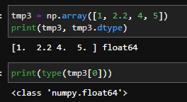 보시면 정수와 실수를 섞어서 Numpy배열을 만들었고,