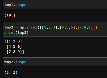 네 임의로 3X3 배열인 tmp2를 만들고 shape로 확인 해 보니 (3,3)으로 Numpy배열의 정보를 알 수 있습니다.
