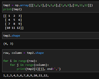 한가지 팁을 드리자면, 이 shape 값을 언패킹 해서 반복문을 돌면 원소의 값을 모두 확인 해 볼 수 있습니다. (파이썬 코딩의 기술 way 13 참고)
